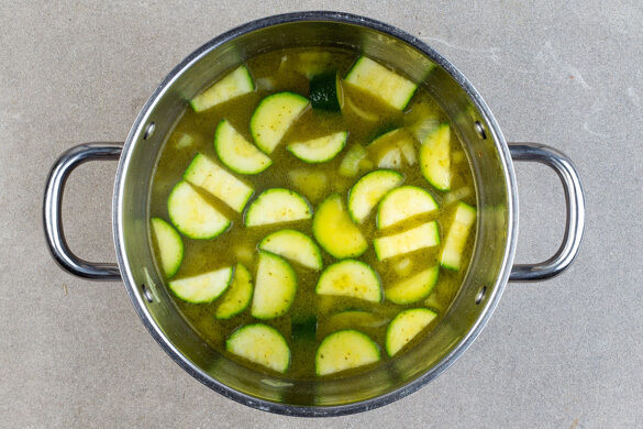 Die Zucchini, die Kartoffeln, die Zwiebeln und den Knoblauch in einem mittelgroßen Topf mit 2EL Olivenöl und 1 Prise Salz bei mittlerer Hitze 2–3Min. anbraten. 500ml heißes Wasser angießen, das Brühgewürz unterrühren und das Gemüse bei mittlerer Hitze ca. 10Min. köcheln lassen.