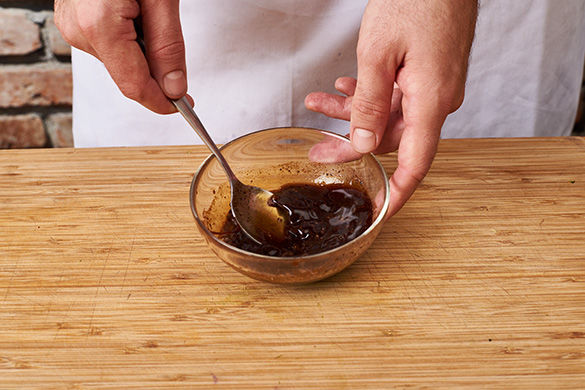 Die Sojasauce mit der Gewürzmischung und dem Honig verrühren. Den Backofen auf 180°C Umluft (200°C Ober-/Unterhitze) vorheizen.
