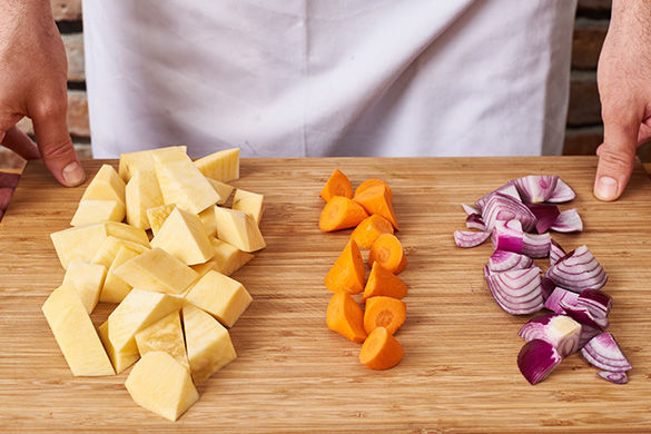 Die Karotte und die Steckrübe schälen und in 1–2cm große Stücke schneiden. Die Zwiebel schälen, halbieren und grob würfeln. Das Gemüse mit etwas Salz und Zucker vermengen und beiseitestellen.