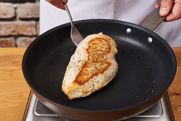 Inzwischen das Hähnchenfleisch in einer großen Pfanne mit 2EL Olivenöl von beiden Seiten ca. 1–2Min scharf anbraten. Das Fleisch in eine kleine Auflaufform geben, die Pfanne beiseitestellen.