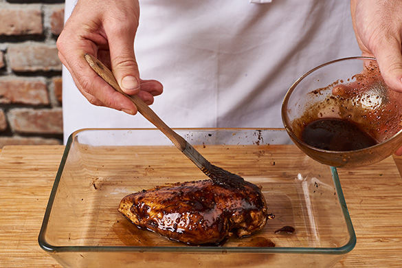 Das Hähnchen ca. 8–10Min. im Ofen garen, dabei zwischendurch immer wieder mit der Sauce bepinseln und wenden, damit alle Seiten gleichmäßig glasiert werden.