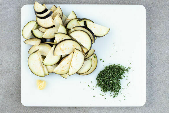 Den Backofen auf 250°C (230°C Umluft) vorheizen. In einem großen Topf ausreichend gesalzenes Wasser für die Pasta zum Kochen bringen. Die Auberginen längs halbieren und quer in dünne Scheiben schneiden. Den Knoblauch schälen und fein würfeln. Die Oreganoblättchen abzupfen und fein schneiden.