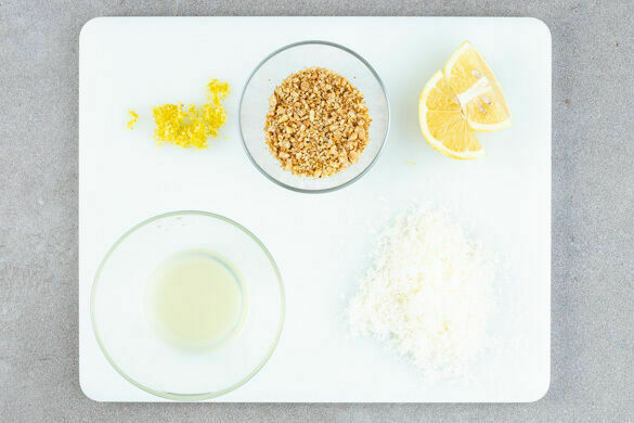 Die Walnüsse fein hacken und in einer kleinen Pfanne ohne Zugabe von Fett bei mittlerer Hitze 1–2Min. anrösten. Vorsicht, die Nüsse können schnell zu dunkel werden. Zum Abkühlen in einem Schälchen beiseitestellen. Die Zitronenschale abreiben und die Zitrone halbieren, eine Hälfte auspressen, die übrige Hälfte in Spalten schneiden. Den Käse fein reiben.