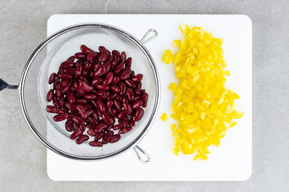 Die Bohnen in einem Sieb mit kaltem Wasser abspülen und abtropfen lassen. Die Paprika vierteln, entkernen und in kleine Würfel schneiden. Die Petersilie bis auf 2EL mit 2EL Olivenöl, 2–3EL Essig sowie je 1 kräftigen Prise Salz und Pfeffer zu einem Dressing verrühren. Die Bohnen und die Paprika mit dem Dressing vermengen und bis zum Servieren ziehen lassen.