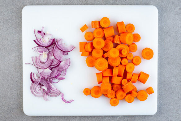 Die Karotten ggf. schälen und in 1–2cm große Stücke schneiden. Die Zwiebel schälen, halbieren und in feine Streifen schneiden.