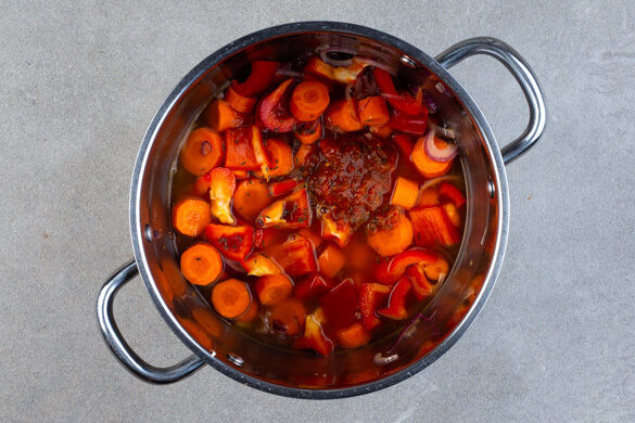 Die Zwiebeln in einem mittelgroßen Topf mit 1EL Olivenöl bei mittlerer Hitze ca. 3Min. anschwitzen. Die Paprika vierteln, entkernen und in 1–2cm große Stücke schneiden.