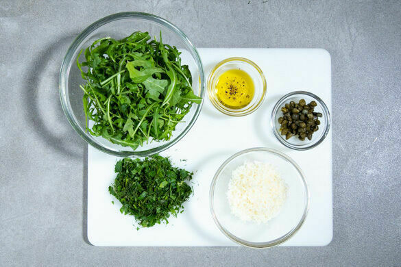 Den Käse fein reiben. Die Petersilie und den Dill samt Stängeln fein hacken. Die Kapern abtropfen lassen und ggf. kalt abspülen. 1EL Olivenöl, 1EL Essig und je 1 kräftigen Prise Salz und Pfeffer zu einem Dressing verrühren und mit dem Rucola vermengen, dann die Kapern und die 1/2 des Käses unterheben.