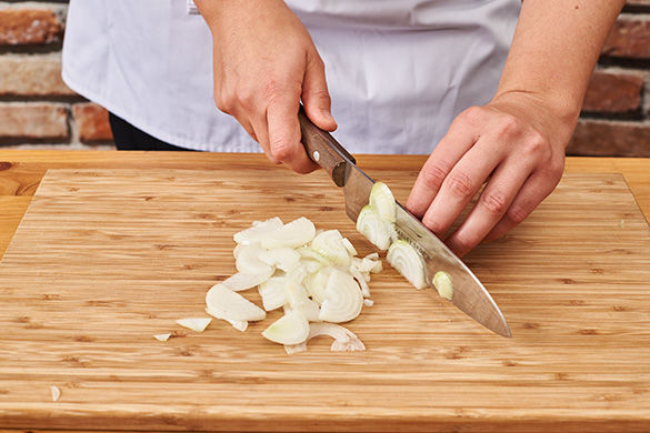 Den Backofen auf 200°C Umluft (220°C Ober-/Unterhitze) vorheizen. Die Zwiebel schälen, halbieren und in dünne Streifen schneiden.