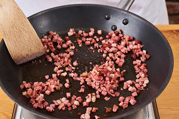 Den Speck in einer mittelgroßen Pfanne ohne Zugabe von Fett bei mittlerer Hitze ca. 1–2Min. anbraten, dann die Zwiebeln hinzugeben und ca. 1–2Min. mitbraten. Vom Herd nehmen und die Speck-Zwiebel-Mischung etwas abkühlen lassen.