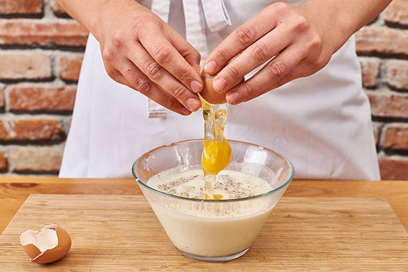 Die Milch mit der Crème fraîche und den Eiern verquirlen, die Speck-Zwiebel-Mischung und den Käse untermischen und mit Salz und Pfeffer würzen. Vorsicht, der Speck und der Käse sind auch schon salzig.