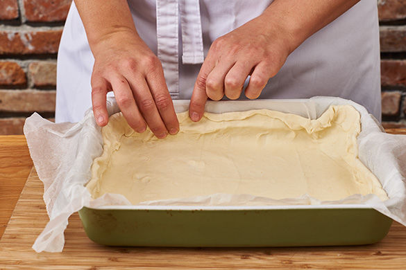 Eine Auflaufform oder eine Tarteform mit Backpapier auslegen. Den Blätterteig mit den Fingern leicht auseinanderziehen oder mit einem Nudelholz etwas ausdünnen und  die Form damit auskleiden, dabei einen 2–3cm hohen Rand formen.