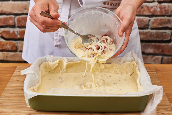 Die Füllung auf dem Teig verteilen und die Quiche im Ofen ca. 25Min. goldbraun backen.