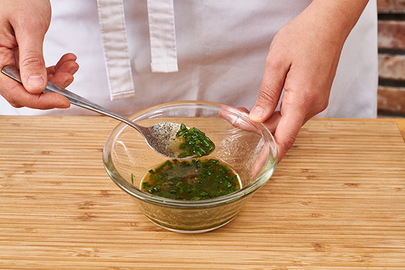 Den Schnittlauch in feine Röllchen schneiden. 1–2EL Olivenöl, 1EL Essig und ggf. etwas Wasser zu einer Vinaigrette verrühren, die 1/2 des Schnittlauchs untermischen und mit Salz und Pfeffer abschmecken. Den Feldsalat unterheben. Die Quiche mit dem restlichen Schnittlauch garniert servieren und den Salat dazu reichen.
