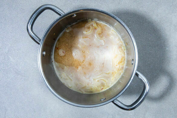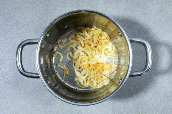 Die Zwiebeln schälen, halbieren und in feine Streifen schneiden, dann in demselben Topf mit 4EL Butter und 1 kräftigen Prise Salz bei mittlerer Hitze 4–5Min. anbraten. Die Hitze ggf. erhöhen und die Zwiebeln weiterbraten, bis die Butter zu bräunen beginnt, dann sofort vom Herd nehmen.