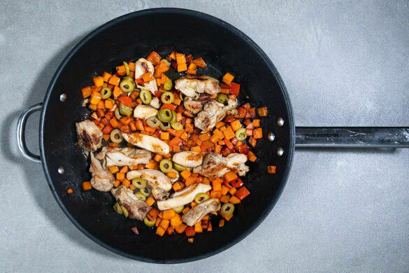 Die Süßkartoffeln schälen und in 1–2cm große Würfel schneiden. Die Paprika vierteln, entkernen und in 1–2cm große Stücke schneiden. Die Süßkartoffeln und die Paprika in einer großen Pfanne mit 2EL Olivenöl und 1/2TL Salz abgedeckt bei mittlerer Hitze ca. 7Min. braten, bis das Gemüse weich und leicht gebräunt ist, dabei regelmäßig umrühren.
