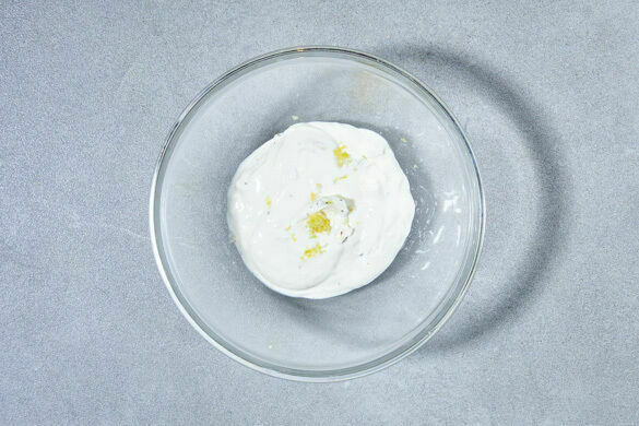 Den Knoblauch schälen, fein würfeln und mit der Crème fraîche, der Zitronenschale, dem übrigen Zitronensaft, 1TL Honig und 5–7EL Wasser mischen. Mit Salz und Pfeffer abschmecken. Die 1/2 des Fleischs und des Gemüses samt Sauce unter den Couscous mengen. Das übrige Fleisch und Gemüse mit den Mandeln auf dem Couscous anrichten und mit der Creme servieren.