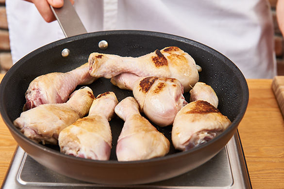 In einer großen Pfanne die Hähnchenteile mit 1EL Olivenöl ca. 5–6Min. bei starker Hitze anbraten, bis die Drumsticks goldbraun sind. Aus der Pfanne nehmen und beiseitestellen.