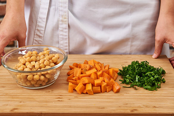 Inzwischen die Karotten schälen und in ca. 2cm große Würfel schneiden. Die Petersilie samt Stängeln grob hacken. Die Kichererbsen in ein Sieb abgießen und abtropfen lassen.