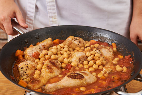 Die Karotten mit den Rosinen in der Pfanne mit 1EL Olivenöl ca. 1–2Min. leicht anbraten, mit den Tomaten und 100ml Wasser ablöschen. Das Hähnchen dazugeben und ca. 10–12Min. garen. Die Kichererbsen untermischen und ca. 2Min. erwärmen. Mit Ras el Hanout, Salz und Pfeffer und abschmecken.