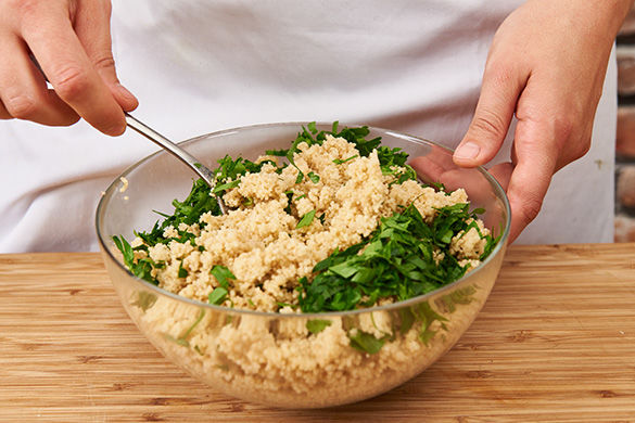 Währenddessen den Brühwürfel im kochenden Wasser auflösen, den Topf vom Herd nehmen und den Couscous langsam in die Brühe einrieseln lassen. Umrühren und abgedeckt ca. 10Min. quellen lassen.