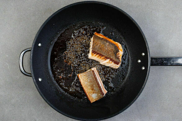 Den Fisch mit kaltem Wasser abspülen, trocken tupfen und evtl. vorhandene Gräten und Schuppen entfernen, dann in einer großen, beschichteten Pfanne mit 1EL Olivenöl bei mittlerer Hitze auf der Hautseite 7–9Min. knusprig anbraten. Den Fisch wenden und weitere 2–4Min. braten, bis er gar ist.