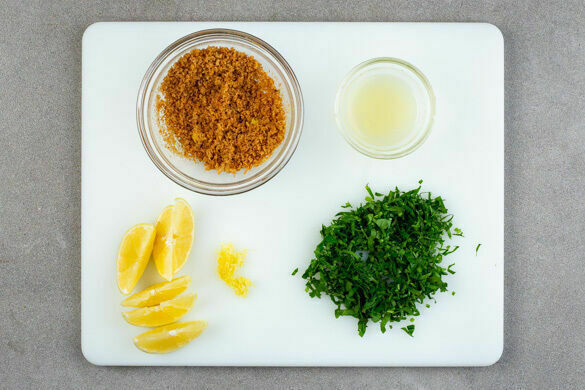 Den Knoblauch und die Semmelbrösel mit 1TL Butter in einer kleinen Pfanne bei mittlerer Hitze ca. 3Min. leicht braun anrösten und aus der Pfanne nehmen. Die Schale einer Zitrone abreiben, dann die Zitrone halbieren und auspressen, die andere Zitrone in Spalten schneiden. Die Zitronenschale unter die Brösel mengen. Die Petersilie samt Stängeln fein hacken.
