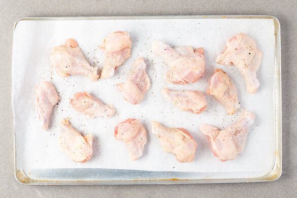 Den Backofen auf 230°C (210°C Umluft) vorheizen. Das Fleisch trocken tupfen, mit 2EL Olivenöl, 1/2TL Salz und 1 kräftigen Prise Pfeffer vermengen, dann auf einem mit Backpapier ausgelegten Backblech im Ofen 25–35Min. goldbraun backen.