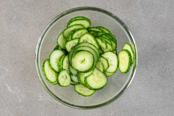 Die Zitronenschale abreiben, dann die Zitrone halbieren und auspressen. Die Gurke in dünne Scheiben schneiden und mit 2EL Zitronensaft, 1TL Honig und 1/2TL Salz vermengen.