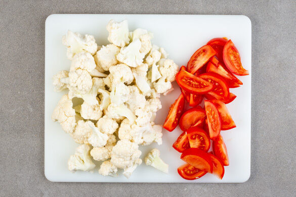 Inzwischen den Blumenkohl in 2–3cm große Röschen und den Strunk in ca. 1cm große Würfel schneiden. Die Tomaten in ca. 1cm breite Spalten schneiden.