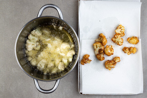 Die 1/2 des Blumenkohls in das heiße Öl geben und bei starker Hitze in 3–4Min. goldbraun und gar frittieren. Mit einer Schaumkelle herausnehmen, auf einem mit Küchenkrepp ausgelegten Backblech abtropfen lassen und mit je 1 kräftigen Prise Salz und Pfeffer würzen. Den Vorgang mit dem restlichen Blumenkohl wiederholen. Tipp: Je nach Größe des Topfs ggf. kleinere Portionen frittieren.