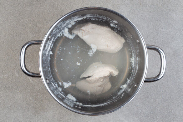 Das Fleisch trocken tupfen und jeweils horizontal halbieren, dann in einem großen Topf mit ausreichend Wasser bedecken, 2EL Salz zugeben und zum Kochen bringen. Tipp: Beim Kochen wird nicht die gesamte Salzmenge vom Fleisch aufgenommen. Das Fleisch abgedeckt bei mittlerer Hitze in 7–8Min. gar köcheln, aus dem Topf nehmen und auskühlen lassen.