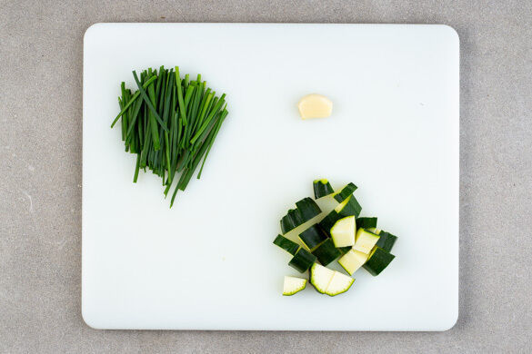 Den Backofen auf 240°C (220°C Umluft) vorheizen. Den Schnittlauch grob schneiden. Den Knoblauch schälen und grob würfeln. Ca. 1/3 der Zucchini in kleine Würfel schneiden.