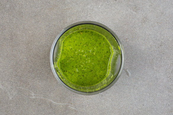 Den Schnittlauch, den Knoblauch, die Zucchiniwürfel, die Kürbiskerne, 2EL Olivenöl und 1EL Wasser in einem hohen Gefäß mit einem Stabmixer zu einem cremigen Pesto pürieren. Mit Salz und Pfeffer abschmecken.