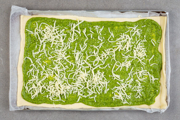 Den Teig mit dem Papier nach unten auf einem Backblech ausrollen, dann gleichmäßig mit dem Pesto bestreichen und den Käse darauf verteilen.