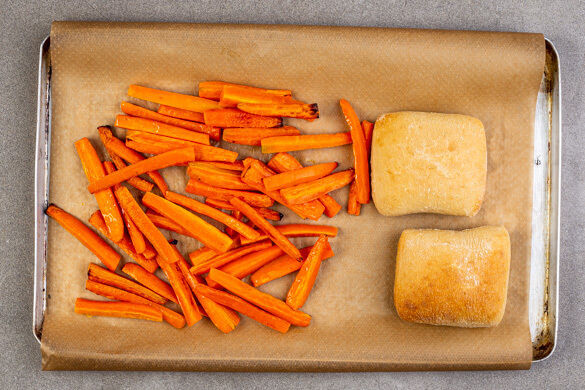 Die Brötchen in 6–8Min. vor Ende der Backzeit zu den Karotten auf das Backblech legen und goldbraun aufbacken, die Karotten je nach Größe des Blechs etwas zur Seite schieben.