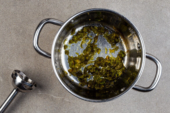 Die 1/2 der grünen Paprika, die Peperoni und die Lauchzwiebeln in einen kleinen Topf geben und mit 1EL Essig, 3EL Wasser, 1,5EL Zucker und 1 Prise Salz bei mittlerer Hitze in 12–15Min. weich kochen. Das Gemüse mit einem Stabmixer fein pürieren und ggf. löffelweise Wasser hinzufügen, falls die Peperonikonfitüre zu dickflüssig ist. Mit Salz abschmecken.