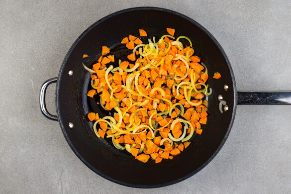 Die Karotte ggf. schälen, längs vierteln und quer in dünne Scheiben schneiden. Die Zwiebel schälen, halbieren und in feine Streifen schneiden. Das Gemüse in einer großen Pfanne mit 1EL Butter bei mittlerer Hitze in 5–7Min. goldbraun anbraten.