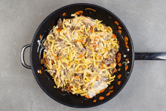 Das Hackfleisch zu dem Gemüse in die Pfanne geben, bei mittlerer bis starker Hitze 3–4Min. krümelig anbraten und mit 1 kräftigen Prise Salz würzen. Die Spätzle unterheben und bei starker Hitze 3–4Min. mitbraten, dann die Sauce zugießen und alles gut vermengen. Die Pfanne vom Herd nehmen und die Spätzle abgedeckt warm halten.