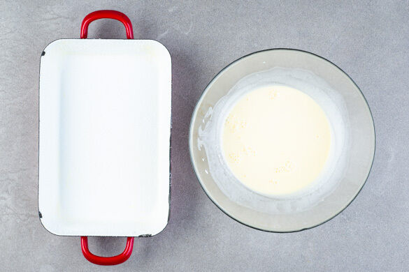 Den Backofen auf 200°C (180°C Umluft) vorheizen. Die Eier und 250ml Sahne mit einem Schneebesen verquirlen. Eine mittelgroße Auflaufform mit etwas Butter fetten, dann mit 1EL Zucker bestreuen und die Form hin und her bewegen, sodass der Boden gleichmäßig von Zucker bedeckt ist.
