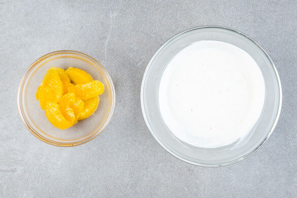 Die Orange mit einem scharfen Messer so schälen, dass auch die weiße Haut entfernt wird. Das Fruchtfleisch in ca. 1cm dicke Spalten schneiden. Die restliche Sahne mit dem restlichen Vanillezucker in ein hohes Gefäß geben und mit einem Handrührgerät steif schlagen. Die Schlagsahne bis zum Servieren kalt stellen.