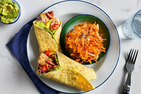 Stell dir vor: Köstlich duftender Bacon brutzelt in deiner Pfanne und in dem schmackhaften Bratfett bräunen feine Hähnchenstreifen. Diese Köstlichkeiten kommen in eine warme, weiche Tortilla, die du nun mit knackiger Paprika, frischer Tomate und süßsauer eingelegten Zwiebeln füllst. Und jetzt: Die Augen schließen, abbeißen und den Augenblick genießen, wenn cremige Guacamole deinen Gaumen umhüllt. Ein wahres Träumchen!