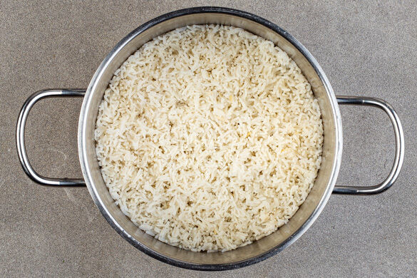 Den Reis in einem Sieb kalt abspülen, bis das Wasser klar bleibt. Sobald das Wasser kocht, den Reis hineingeben und abgedeckt bei niedrigster Hitze 10–12Min. kochen, bis das Wasser aufgesogen und der Reis gar ist. Noch ca. 5Min. ohne Hitzezufuhr ziehen lassen.