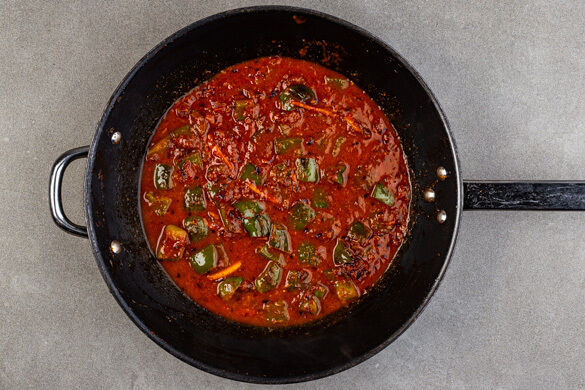 Den Ingwer und den Knoblauch in die Pfanne zu dem Gemüse geben und ca. 2Min. mitbraten. Das Tomatenmark einrühren und weitere ca. 2Min. braten, dann die Gewürzmischung hinzufügen und ca. 30Sek. erhitzen. Mit 1TL Essig ablöschen und anschließend 2EL Milch, 240ml Wasser, 1/2TL Honig und 1TL Salz unterrühren.