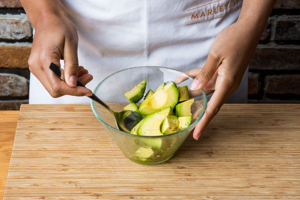 Die Avocado halbieren und den Kern entfernen. Das Avocadofleisch rautenförmig einschneiden und die Avocadowürfel mit einem großen Löffel aus der Schale lösen. Nach Geschmack mit Salz und Pfeffer sowie 1–2EL Sherryessig würzen.