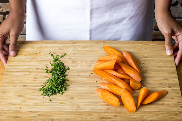 Den Backofen auf 180°C Umluft (200°C Ober-/Unterhitze) vorheizen. Die Karotten schälen und diagonal in 2–3cm große, mundgerechte Stücke schneiden. Die Petersilienblätter von den Stängeln zupfen und fein hacken.