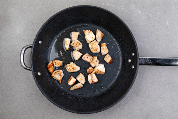 Das Fleisch trocken tupfen und in einer großen Pfanne mit 1EL Pflanzenöl bei mittlerer bis starker Hitze 3–4Min. kross anbraten, aus der Pfanne nehmen und beiseitestellen.