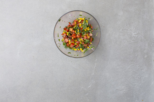 Die übrigen Zwiebeln mit den Tomaten, dem Koriander, 1–2TL Limettenschale, 1–2TL Limettensaft, dem Mais und 2EL Olivenöl verrühren. Tipp: Wer keine rohen Zwiebeln mag, kann diese vorher ca. 2Min. in einem Schälchen mit heißem Wasser ziehen lassen, dann abgießen und verwenden. Die Salsa mit Salz, Pfeffer und nach Belieben mehr Limette abschmecken.