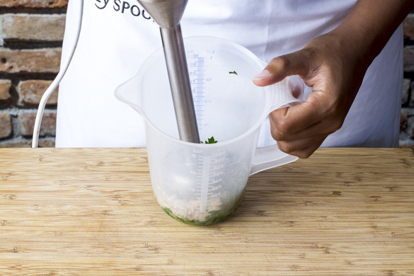 Die Petersilie samt Stängeln grob hacken. Den Knoblauch schälen und grob würfeln. Die Petersilie, den Knoblauch und die gerösteten Mandelblättchen mit 1 großzügigen Prise Salz und Pfeffer, 3TL Olivenöl und 1–2TL Wasser zu einem cremigen Pesto pürieren.