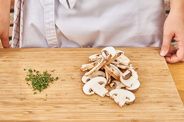 Den Backofen auf 200°C Umluft (220°C Ober-/Unterhitze) vorheizen. Die Pilze ggf. mit etwas Küchenkrepp oder einer Bürste säubern und in dünne Scheiben schneiden. Die Thymianblätter von den Stängeln streifen und fein hacken.