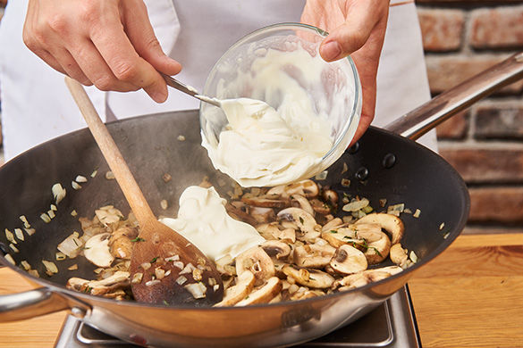 Die Zwiebeln schälen, halbieren und in möglichst feine Würfel schneiden. Die Zwiebelwürfel mit dem Thymian in einer großen Pfanne mit 1EL Olivenöl bei mittlerer Hitze 1–2Min. glasig andünsten. Die Pilze hinzufügen und ca. 2–3Min. bei starker Hitze scharf anbraten. Mit der Crème fraîche ablöschen, gut verrühren und ca. 1–2Min. einköcheln lassen.